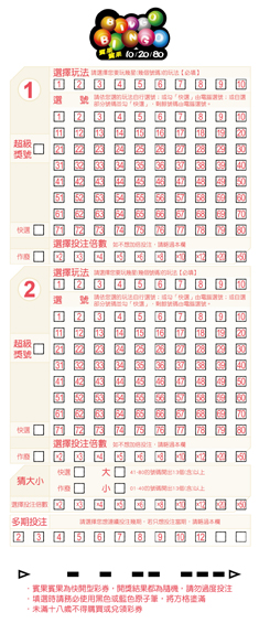 每張「BINGO BINGO 賓果賓果」選號單都有2個選號區(1組和第2),每個選號區皆有80個號碼(01~80), 您可以依照自己的喜好,自由採用以下幾種不同的方式填寫選號單,進行投注。