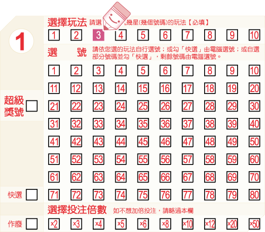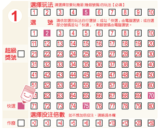 在選號區中,從01~80的號碼中自行填選少於玩法數的號碼,並劃記「快選」,投注機將自動為您選出剩下的號碼。 以下圖為例,如果您選擇「5星」玩法,自選3個號碼—027075,並劃記「快選」,其餘2個號碼將由投注機為您快選產生。