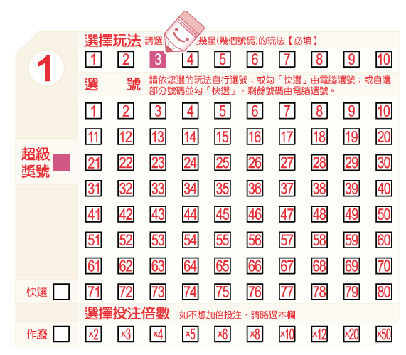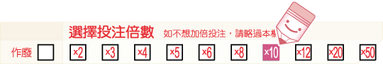 您可就某組選號加倍投注,投注倍數最高為50倍。如果您不想加倍投注,則不需要填寫該欄。