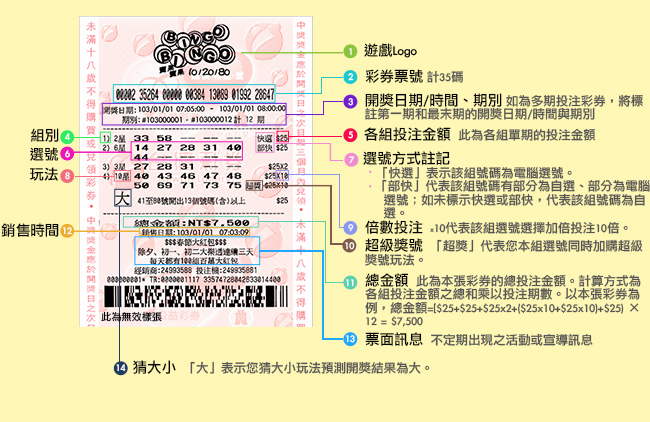 注意事項:彩券銷售後如遇有加開期數之情況,多期投注之期數將順延。若彩券上的資料和電腦紀錄的資料不同,以電腦紀錄資料為準。
