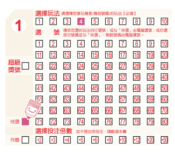 在選號區中,劃記「快選」,投注機將根據您選擇的玩法,隨機產生一組號碼。例如,如果您在「玩法」欄中填選的是「4星」,且您劃記「快選」,投注機將為您隨機產生四個號碼。